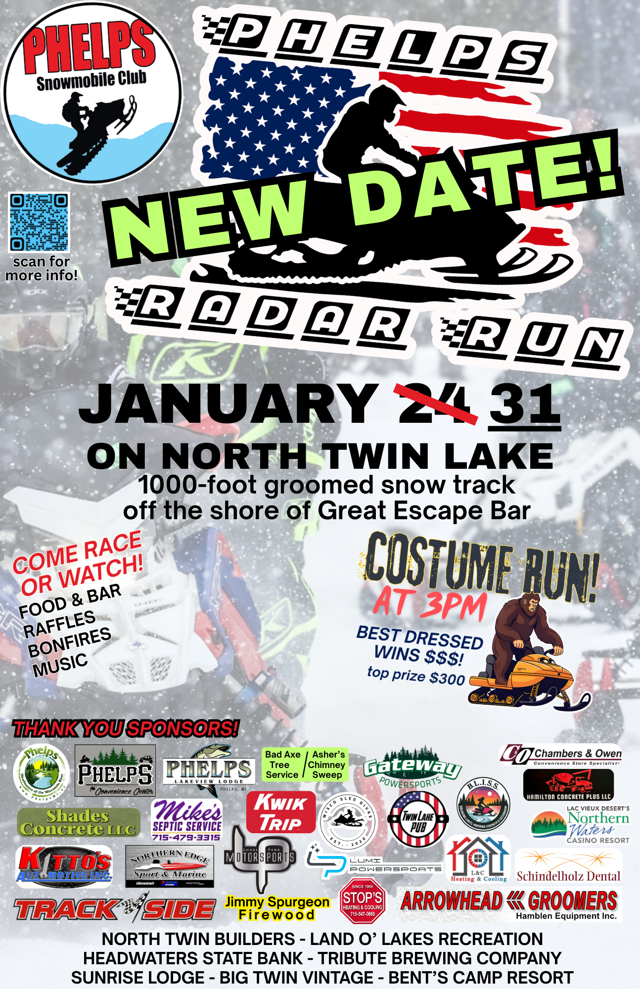 Great Escape 2510 Highway 17, Phelps, WI, United States2026 Phelps Radar Run on Jan 31 was a huge success! Thank you to all who came out and raced. We had 124 racers and 305 runs down the track - wow! 2027 Phelps Radar Run will be January 23, 2027 - save the date! Phelps Snowmobile Radar Run is on North Twin Lake run by the Phelps Snowmobile Club ...
